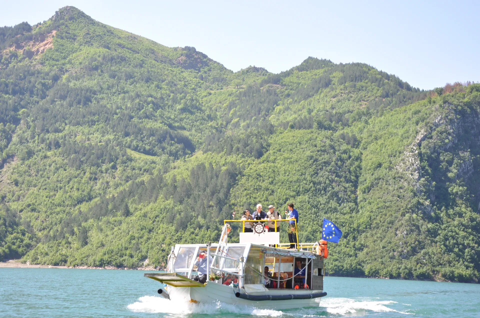 Tour boat crossing the widest expanse of the Koman reservoir, surrounded by wild nature.