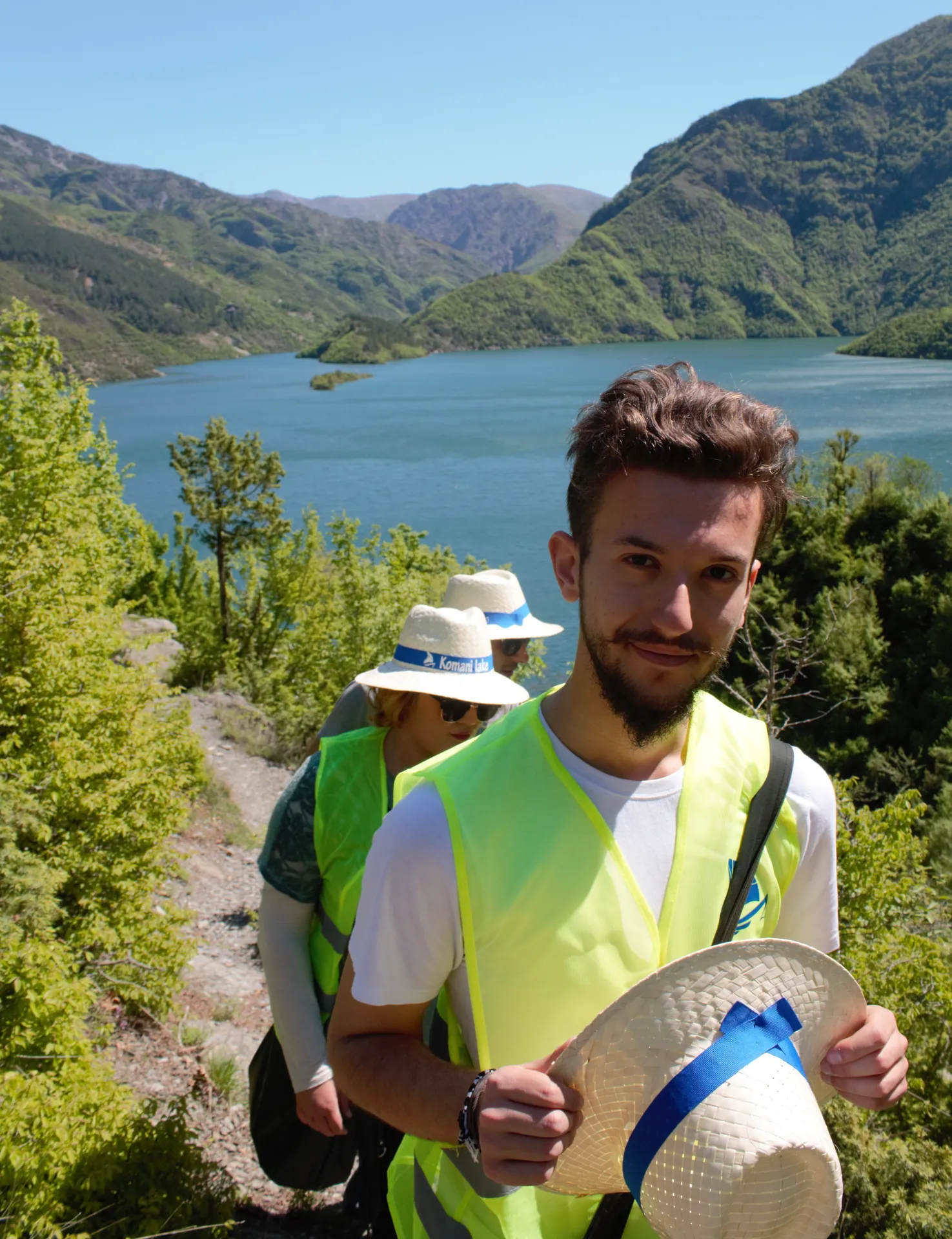 Tour Guests hiking along the scenic mountain trails overlooking the Komani Lake reservoir.