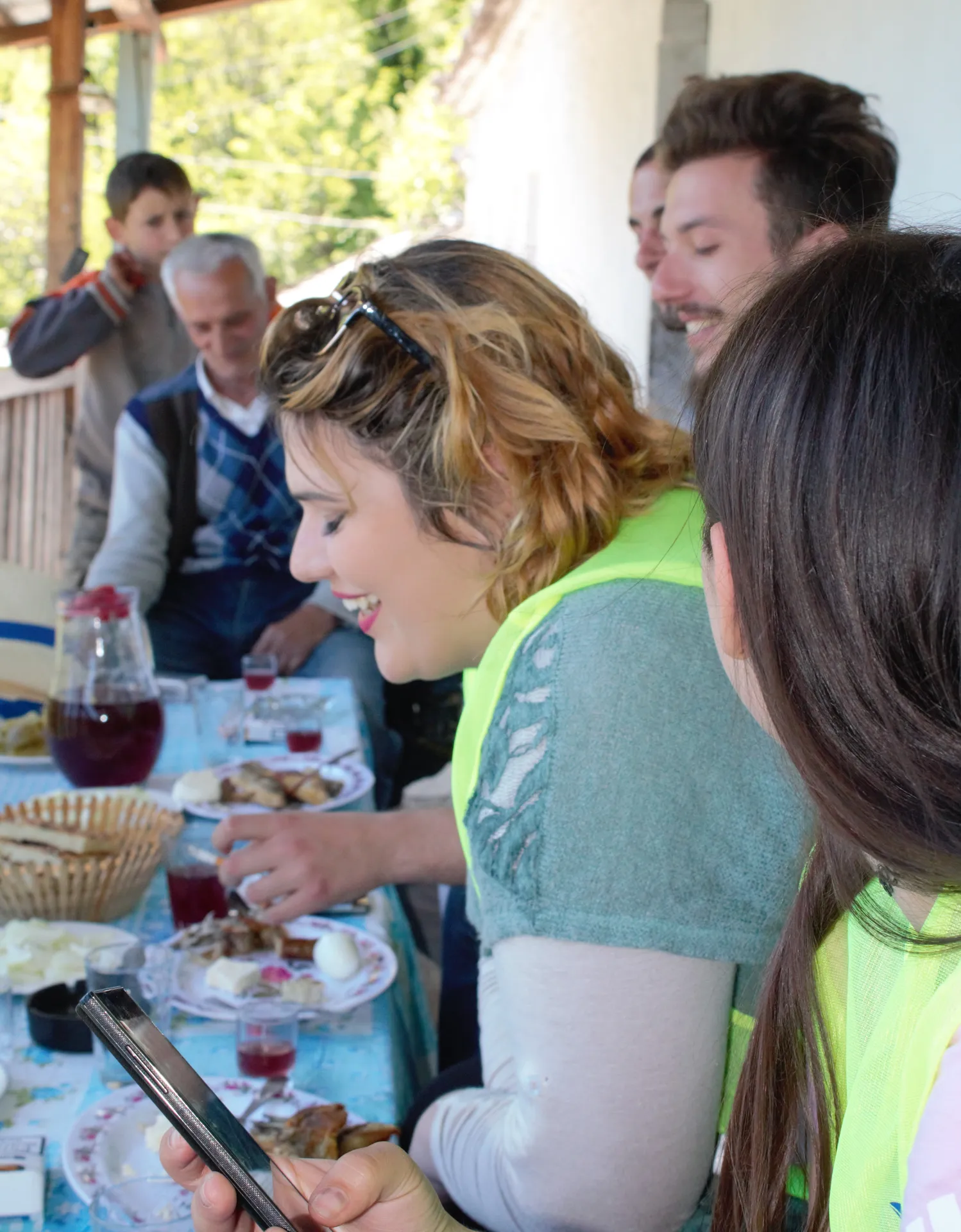 Group lunch at a traditional guesthouse shaded by grapevines.
