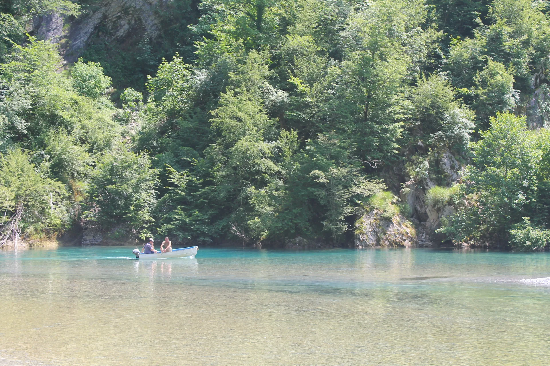 Tranquil turquoise waters of the Shala River flanked by sunlit green canyon walls.
